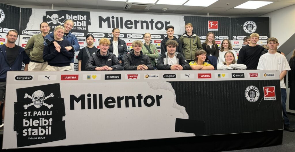 ”Rothosen” versus ”Kiezkicker”: Fankultur i Hamburg Den 18. september kørte to busser med forventningsfulde elever til Hamburg – en bus fra Tønder Gymnasium og en bus fra Aabenraa Statsskole. Formålet med turen var at afdække forskellige fankulturer i tysk fodbold, specielt i Hamburg. Dertil skulle der føres interviews både med fans fra Hamburger Sportverein (HSV) og FC St. Pauli Hamburg. Fra Tønder Gymnasium deltog et såkaldt turbotyskhold, bestående af elever på modersmålsniveau. Fra Aabenraa Statsskole deltog et normalt B-niveau-hold. Eleverne blev inddelt i blandede grupper. Dermed byggede eleverne fra Tønder Gymnasium bro for eleverne fra Aabenraa Statsskole til at kunne kommunikere med målgruppen: fans fra de to klubber fra Hamburg. Eleverne blev vist rundt på Volksparkstadion (HSV) og Stadion am Millerntor (St. Pauli). Begge steder hørte de om klubbernes historie og om forskellen mellem de to klubber. Der blev flittigt taget fotoer og videoer, som skal bruges til at fremstille en film (med undertekster), der skal bruges til brobygning med folkeskoleelever. Når der skal skrives undertekster, er der igen brug for de forskellige kompetencer i tysk hhv. dansk, som eleverne fra Aabenraa Statsskole og Tønder Gymnasium har.